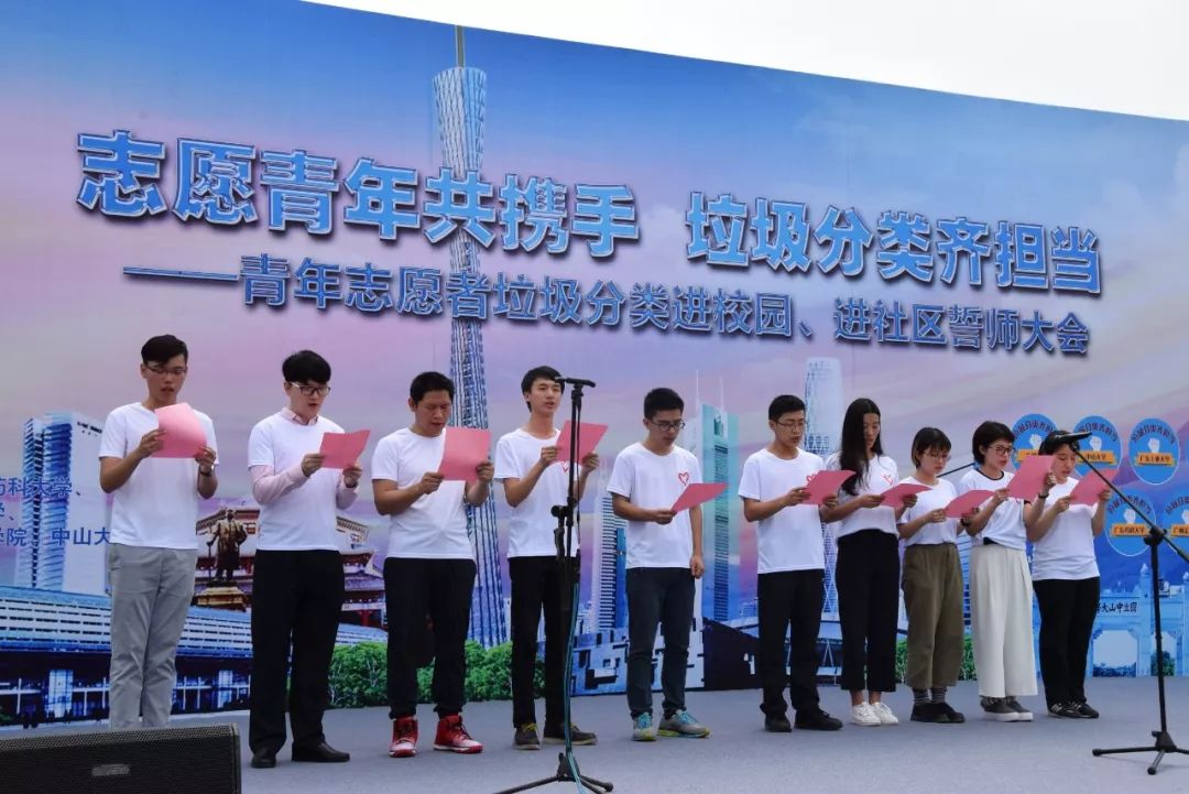 △2017年5月6日,廣州市番禺區(qū)大學城中心湖公園召開“志愿青年共攜手,垃圾分類齊擔當”為主題的青年志愿者垃圾分類進校園、進社區(qū)誓師大會,大學生宣誓現(xiàn)場 。