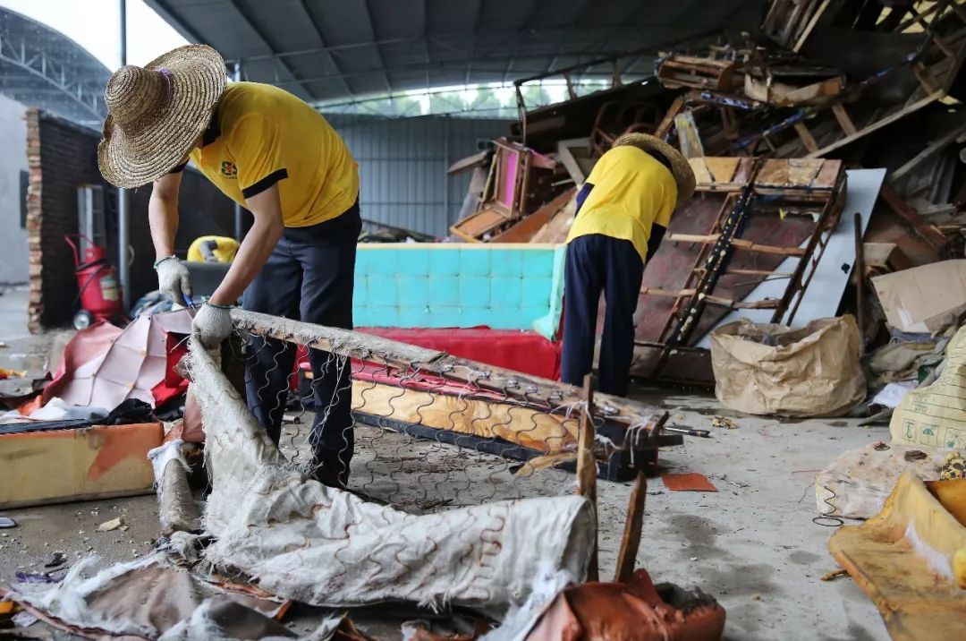 △城管委帶隊督查花都區(qū)垃圾分類成效,供銷社垃圾分類點,工作人員在將回收回來的低附加值廢棄家具進行破拆,分類成木材、布料、海綿等經(jīng)行回收。圖為工作人員在破拆一張沙發(fā)