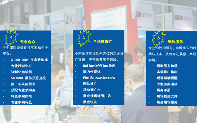 CHINA DIECASTING 2019中國(guó)壓鑄展和CHINA NONFERROUS 2019中國(guó)有色展是展商尋找重要客戶群體、建立全新業(yè)務(wù)聯(lián)系的理想平臺(tái)。2018年414家參展商中90%的展商確認(rèn)他們?cè)谡箷?huì)上找到了主要目標(biāo)群體。2019年展會(huì)前期將有專業(yè)團(tuán)隊(duì),通過(guò)呼叫中心、訂制化邀請(qǐng)函、展前預(yù)覽直投等多渠道邀請(qǐng)重要買家和專業(yè)觀眾,設(shè)計(jì)特色參觀路線,提供專業(yè)參觀導(dǎo)覽,提高展商與采購(gòu)的配對(duì)效率。