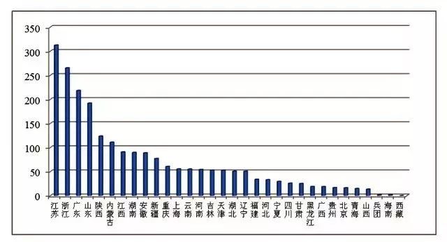 2017年各省區(qū)市危險(xiǎn)廢物持證單位實(shí)際收集和利用處置量。資料來源:生態(tài)環(huán)境部