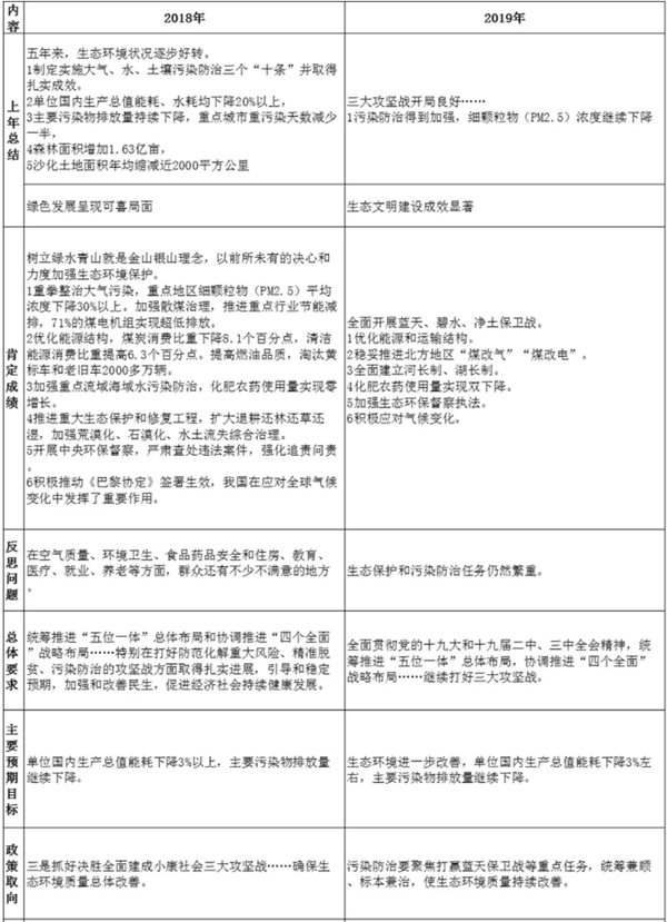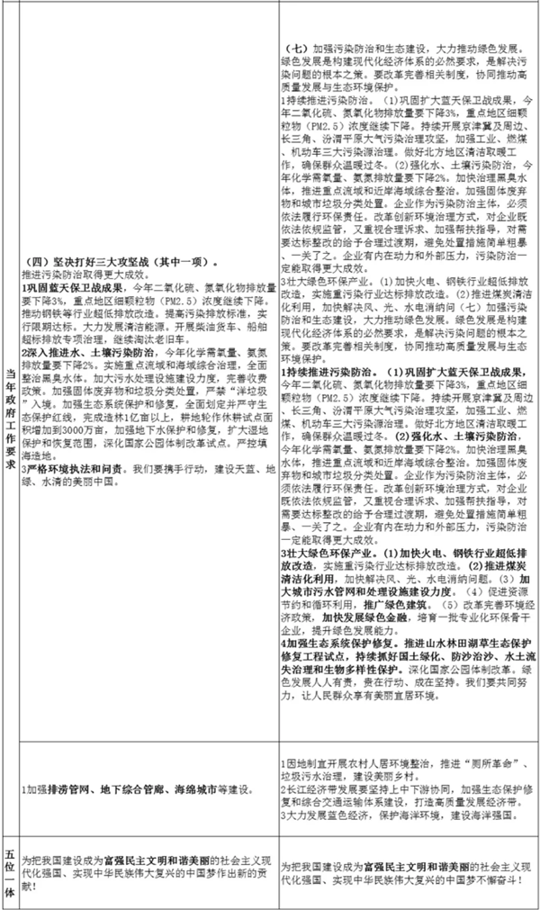 原文:“持續(xù)推進(jìn)污染防治。鞏固擴(kuò)大藍(lán)天保衛(wèi)戰(zhàn)成果,今年二氧化硫、氮氧化物排放量要下降3%,重點(diǎn)地區(qū)細(xì)顆粒物(PM2.5)濃度繼續(xù)下降。持續(xù)開(kāi)展京津冀及周邊、長(zhǎng)三角、汾渭平原大氣污染治理攻堅(jiān),加強(qiáng)工業(yè)、燃煤、機(jī)動(dòng)車(chē)三大污染源治理。做好北方地區(qū)清潔取暖工作,確保群眾溫暖過(guò)冬。強(qiáng)化水、土壤污染防治,今年化學(xué)需氧量、氨氮排放量要下降2%。加快治理黑臭水體,推進(jìn)重點(diǎn)流域和近岸海域綜合整治。加強(qiáng)固體廢棄物和城市垃圾分類(lèi)處置。企業(yè)作為污染防治主體,必須依法履行環(huán)保責(zé)任。改革創(chuàng)新環(huán)境治理方式,對(duì)企業(yè)既依法依規(guī)監(jiān)管,又重視合理訴求、加強(qiáng)幫扶指導(dǎo),對(duì)需要達(dá)標(biāo)整改的給予合理過(guò)渡期,避免處置措施簡(jiǎn)單粗暴、一關(guān)了之。企業(yè)有內(nèi)在動(dòng)力和外部壓力,污染防治一定能取得更大成效。”