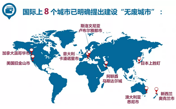 國際上 8 個(gè)城市已明確提出建設(shè)“無廢城市”(見下圖),其建設(shè)成效已獲得國際社會(huì)認(rèn)可。雖然因資源稟賦、政治體制、管理制度、文化習(xí)慣等不同,在建設(shè)“無廢城市”過程中采取的路徑和措施存在較大差異,但相同的是,這些城市均制定了長期且量化的“無廢”目標(biāo),遵循廢棄物避免、減少、重復(fù)使用、循環(huán)利用、能量恢復(fù)、填埋的處理優(yōu)先級(jí)順序,并不斷完善廢棄物管理體系、引入專業(yè)化的管理等。