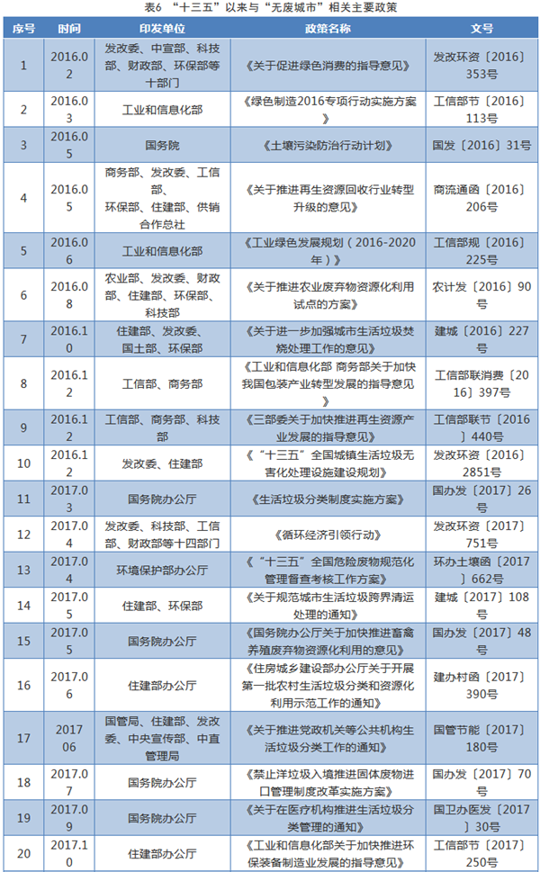 表6 “十三五”以來與“無廢城市”相關(guān)主要政策