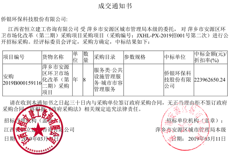 原標(biāo)題:僑銀環(huán)保中標(biāo)2.24億江西萍鄉(xiāng)安源區(qū)環(huán)衛(wèi)市場(chǎng)化項(xiàng)目