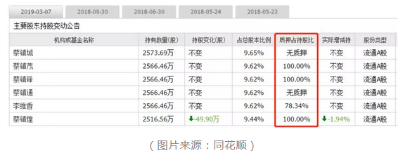 格隆匯查閱資料得知,蔡鎮(zhèn)峰、蔡鎮(zhèn)茂、蔡鎮(zhèn)煌的持股份額均為100%質(zhì)押,李維香的質(zhì)押比例也達(dá)到了78.34%。據(jù)最新公告顯示,李維香已足額向質(zhì)權(quán)人償還了其股權(quán)質(zhì)押融資款。