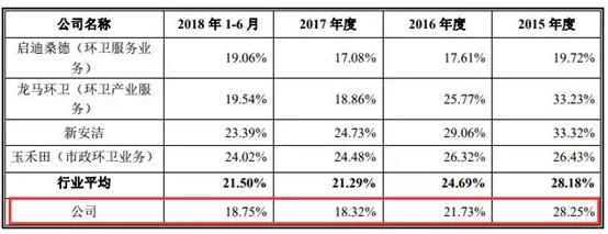 報(bào)告期內(nèi),僑銀環(huán)保毛利率分別為28.22%、21.72%、18.28%、18.75%,呈連續(xù)下降的態(tài)勢,雖然行業(yè)的毛利率也在下降,但下降幅度沒有僑銀環(huán)保大。