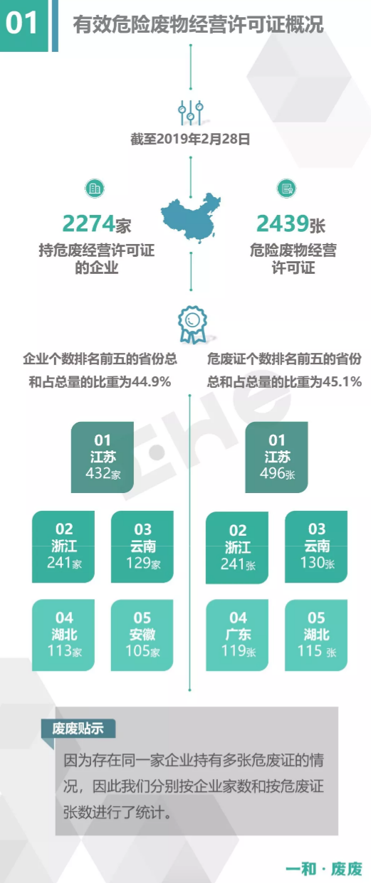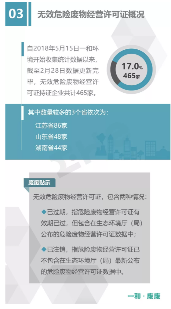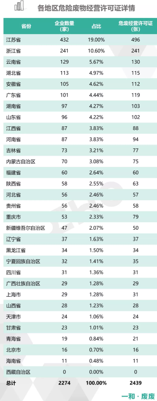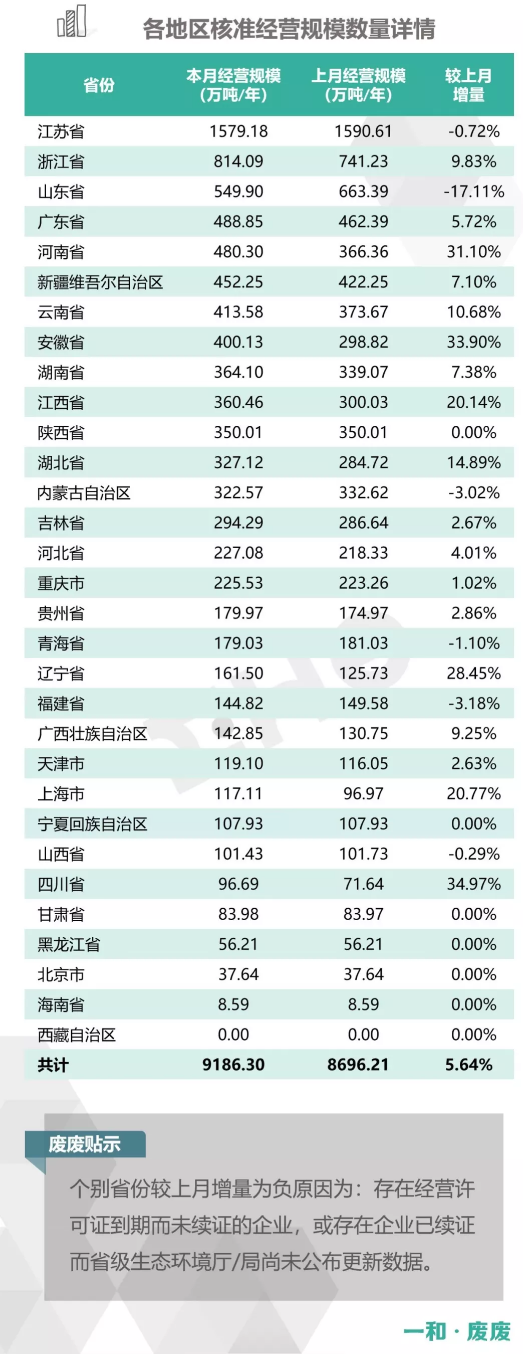 2.統(tǒng)計(jì)范圍:本次數(shù)據(jù)收集統(tǒng)計(jì)的范圍為省級(jí)生態(tài)環(huán)境廳(局)官方公布的持有危險(xiǎn)廢物經(jīng)營許可證企業(yè)的數(shù)據(jù),因此由地級(jí)市發(fā)布的醫(yī)療廢物經(jīng)營許可證、收集經(jīng)營許可證,且未納入省級(jí)生態(tài)環(huán)境廳(局)公布數(shù)據(jù)的部分,并未計(jì)入統(tǒng)計(jì)數(shù)據(jù)中。
