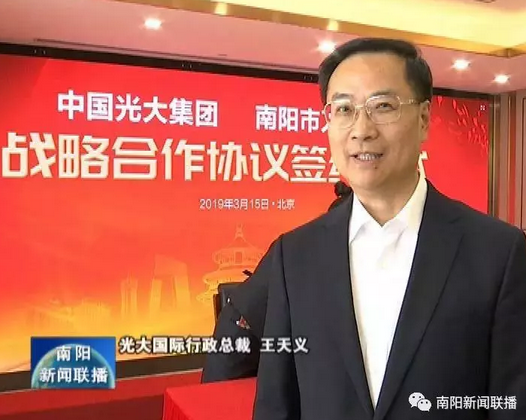 光大國(guó)際行政總裁 王天義:河南是我們很重要的戰(zhàn)略投資地。我們覺得南陽(yáng)又是中國(guó)河南地級(jí)市當(dāng)中最大的市,是個(gè)人口大市、經(jīng)濟(jì)大市,也是一個(gè)環(huán)保大市。所以我們想通過(guò)集團(tuán)與南陽(yáng)市政府戰(zhàn)略合作,全面推進(jìn)我們光大國(guó)際環(huán)保產(chǎn)業(yè)跟南陽(yáng)市政府全面的合作,從垃圾焚燒發(fā)電開始切入,逐步向靜脈產(chǎn)業(yè)園,向無(wú)廢城市拓展我們的合作領(lǐng)域和空間,全面參與南陽(yáng)市生態(tài)文明建設(shè)和經(jīng)濟(jì)社會(huì)的統(tǒng)籌發(fā)展。