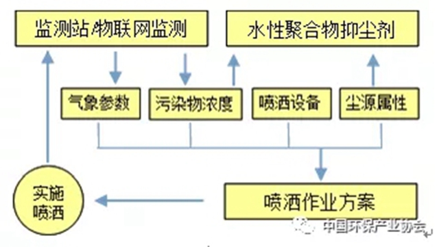 以環(huán)境空氣質(zhì)量監(jiān)測(cè)數(shù)據(jù)為依據(jù)、水性聚合物抑塵劑為主體、智慧化噴灑作業(yè)為實(shí)施方式,提高堆場(chǎng)和城區(qū)揚(yáng)塵治理的有效性。根據(jù)PM2.5、PM10實(shí)時(shí)監(jiān)測(cè)結(jié)果及其變化趨勢(shì),確定水性聚合物抑塵劑的用量和噴灑頻次,根據(jù)塵源屬性確定抑塵劑的品種,根據(jù)實(shí)時(shí)氣象參數(shù)、塵源狀態(tài)以及周邊環(huán)境狀況制定并實(shí)施噴灑作業(yè)方案。
