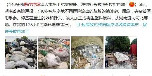 據(jù)央視“3·15”晚會(huì)報(bào)道稱(chēng),輸液瓶、輸液袋、輸液管、一次性注射器等多種醫(yī)療廢棄物,本應(yīng)進(jìn)行集中無(wú)害化處理。但在河南、山東、河北等地,這些廢棄物在廢舊塑料市場(chǎng)里被隨意買(mǎi)賣(mài),有些竟然被加工成了破碎料等待出售,最后被下游企業(yè)加入生料制作成織網(wǎng)袋、蔬菜網(wǎng)袋和兒童玩具。據(jù)悉,上述這些廢棄物都來(lái)自周邊的大醫(yī)院,河北、西安、河南、山西等地都有類(lèi)似的機(jī)構(gòu)回收,輻射范圍相當(dāng)廣泛。