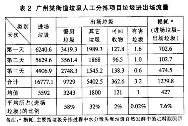 人工分揀生活垃圾可達到1噸/人/天的工作量,同時分揀出0.58噸餐廚垃圾和少量可回收物(0.01噸紙和塑膠、0.035噸塑料袋和0.02噸玻璃)。