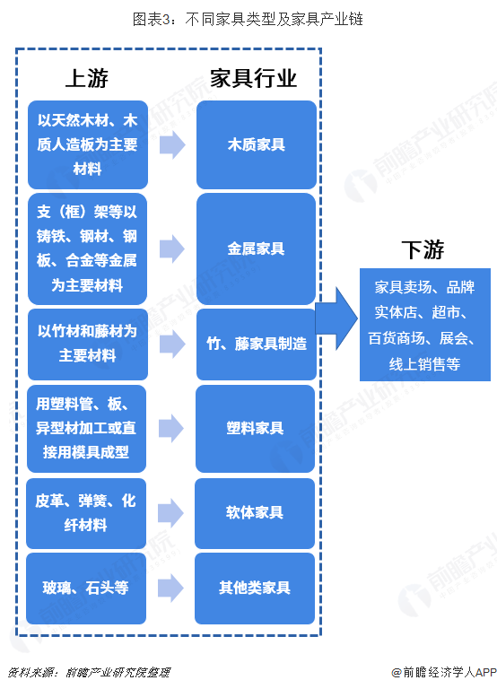 根據(jù)《國民經(jīng)濟產(chǎn)業(yè)分類》中,家具制造業(yè)是指用木材、金屬、塑料、竹、藤等材料制作的,具有坐臥、憑倚、儲藏、間隔等功能,可用于住宅、旅館、辦公室、學(xué)校、餐館、醫(yī)院、劇場、公園、船艦、飛機、機動車等任何場所的各種家具的制造。按照家具其主要使用材料進行分類,包括木質(zhì)家具、金屬家具、竹藤家具、塑料家具及其他家具類型,其對應(yīng)的下游包括家具賣場、品牌實體店、超市、百貨商場、展會及線上銷售等。