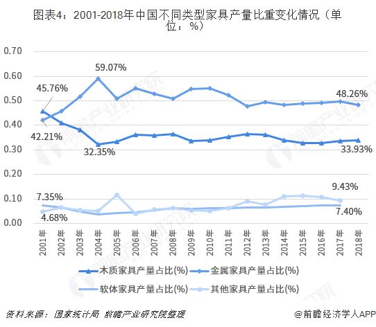 從2001-2018年中國不同類型家具產(chǎn)量占比變化情況看,中國生產(chǎn)的家具以木質(zhì)家具和金屬家具為主,軟體家具、竹藤類家具、塑料家具等所占比重較小;2001年以后,金屬家具產(chǎn)量比重就超過了木質(zhì)家具,金屬家具產(chǎn)量比重基本保持在50%上下,木質(zhì)家具產(chǎn)量比重保持在35%上下。