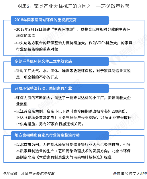 2018年家具產(chǎn)量大幅減產(chǎn)的原因之一是環(huán)保政策的陸續(xù)出臺。環(huán)保政策的收緊,國家及地區(qū)對木質(zhì)家具企業(yè)的污染問題、甲醛問題等陸續(xù)進入進入整治階段,中小家具企業(yè)陸續(xù)倒閉,家具行業(yè)數(shù)量減少,導(dǎo)致全國總產(chǎn)量減少。2018年國家層面對環(huán)保的重視度更高:2018年3月13日組建“生態(tài)環(huán)境部”,以整合以往相對分散的生態(tài)環(huán)境保護職責(zé);中央與地方聯(lián)合的環(huán)保整治力度持續(xù)加大,作為VOCs排放大戶的家具行業(yè)是被監(jiān)控的重點對象;多部重量級環(huán)保文件正式生效實施:針對大氣污染治理、水污染治理、固廢污染治理、噪聲污染治理等收取環(huán)保稅,對于家具制造業(yè)來說是一項全新的不小的開支。環(huán)保力度的不斷加大,淘汰了一批難以達(dá)標(biāo)的小工廠,資源向著大企業(yè)聚集;以江蘇啟東為例,啟東市已下達(dá)《責(zé)令限期整改指令書》280余份,下達(dá)《現(xiàn)場處置決定書》責(zé)令當(dāng)場停產(chǎn)停業(yè)83家、21家企業(yè)被企業(yè)被采取停止供電措施,另有27家自行搬遷或關(guān)閉……