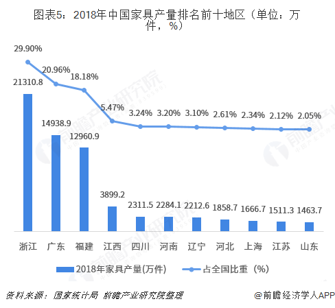 從家具產(chǎn)量整體情況看,2018年中國家具產(chǎn)量排名前十的地區(qū)有浙江、廣東、福建、江西、四川、河南、遼寧、河北、上海、江蘇和山東,有7個是東部地區(qū)。其中浙江省產(chǎn)量高達(dá)2.13億件,占比29.90%,排名第一;廣東地區(qū)產(chǎn)量排名第二,占比20.96%;福建排名第三,占比18.18%。