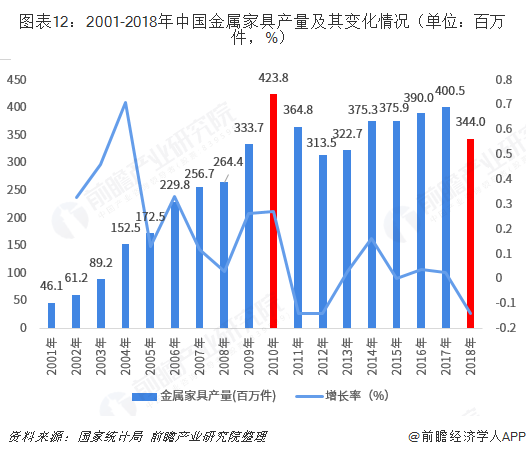 根據(jù)國家統(tǒng)計局統(tǒng)計,金屬家具的發(fā)展階段與家具行業(yè)整體發(fā)展歷程十分相似;2001-2010年處于行業(yè)增長期,2010年金屬家具產(chǎn)量達(dá)到423.8百萬件,達(dá)到歷史最高;2011-2018年行業(yè)處于調(diào)整期,產(chǎn)量漲跌幅度較大。2018年中國家具總產(chǎn)量下降94.26百萬件,僅金屬產(chǎn)量2018年就大幅減產(chǎn)56.51百萬輛,貢獻率高達(dá)60%。