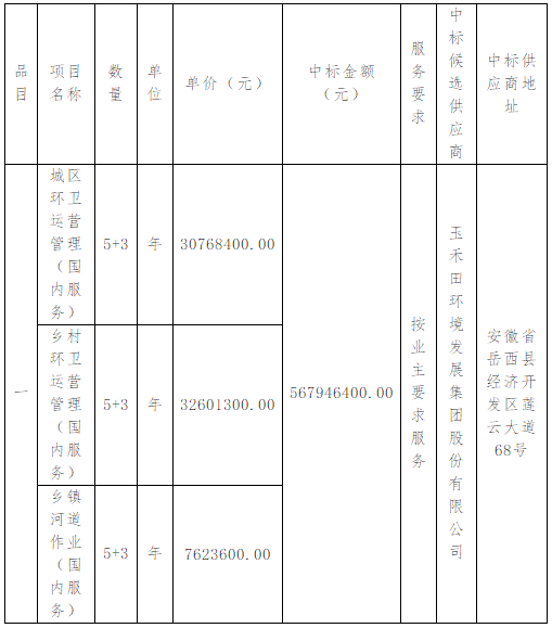 江西省尋烏縣城鄉(xiāng)環(huán)衛(wèi)全域一體化項目發(fā)布中標結(jié)果公告,玉禾田環(huán)境發(fā)展集團股份有限公司成為中標的社會資本方,中標金額為5.68億。