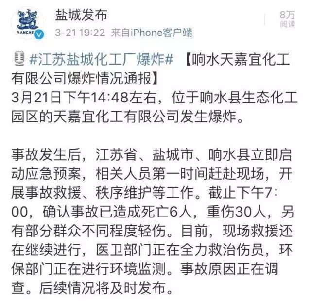 事故發(fā)生后,江蘇省、鹽城市、響水縣立即啟動(dòng)應(yīng)急預(yù)案,相關(guān)人員第一時(shí)間趕赴現(xiàn)場,開展事故救援、秩序維護(hù)等工作。截至3月21日下午7:00,確認(rèn)事故已造成死亡6人,重傷30人,另有部分群眾不同程度輕傷。目前,現(xiàn)場救援還在繼續(xù)進(jìn)行,醫(yī)衛(wèi)部門正在全力救治傷員,環(huán)保部門正在進(jìn)行環(huán)境監(jiān)測。事故原因正在調(diào)查。后續(xù)情況將及時(shí)發(fā)布。
