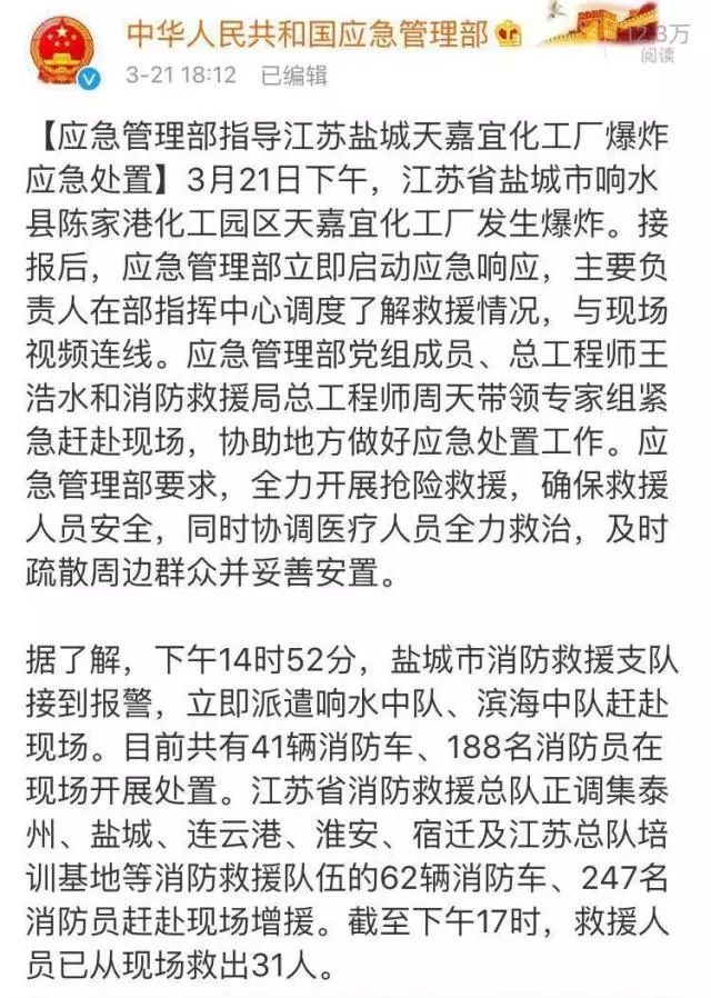 應(yīng)急管理部立即派出有化工、消防專家參加的工作組趕赴現(xiàn)場,并要求全力開展搶險(xiǎn)救援,確保救援人員安全,全力救治傷員,及時(shí)疏散周邊群眾。截至21日19時(shí),江蘇省消防救援總隊(duì)已調(diào)派176輛消防車、928名消防員到場處置,后續(xù)仍將有增援力量趕赴現(xiàn)場。