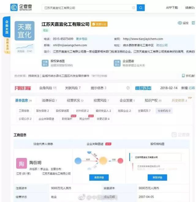 企查查數(shù)據(jù)顯示:江蘇天嘉宜化工有限公司成立于2007年,陶在明任法定代表人,注冊(cè)資本9000萬人民幣,經(jīng)營范圍包括間羥基苯甲酸、苯甲醚、KSS等精細(xì)化工產(chǎn)品制造、化工產(chǎn)品銷售等業(yè)務(wù)。