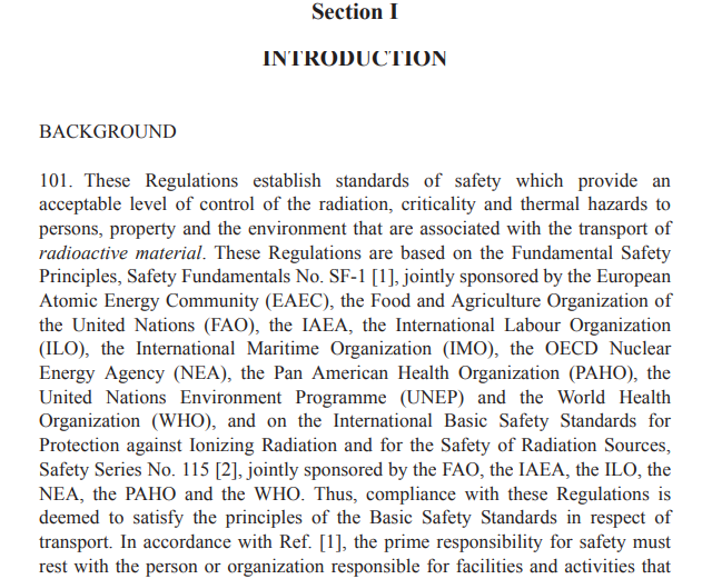 本標準規(guī)定了常規(guī)運輸條件、正常運輸條件和運輸事故條件下放射性物品運輸安全要求。本標準中的運輸要求包括包裝的設計、制造和維護,也包括貨包的準備、托運、裝載、運載(包括中途貯存)以及貨包最終抵達地的接收和卸載。