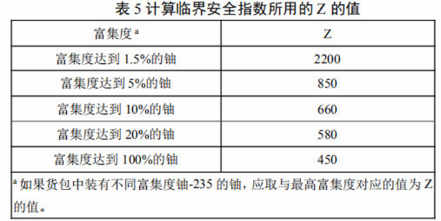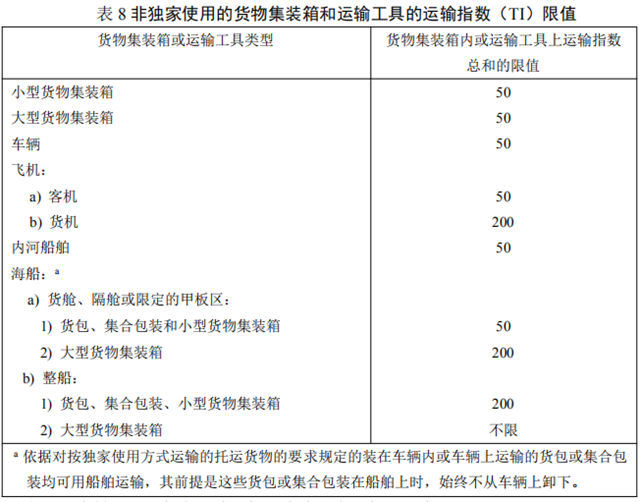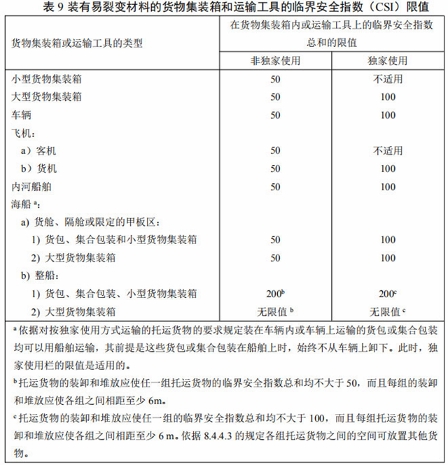 任何貨包或集合包裝的運輸指數(shù)應不超過10,任何貨包或集合包裝的臨界安全指數(shù)應不超過50,按獨家使用方式運輸?shù)耐羞\貨物除外。