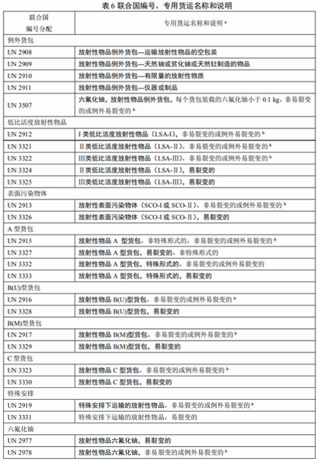 根據(jù)放射性內(nèi)容物的特性、活度水平、比活度和運輸方式對貨包進行分類,具體分為:例外貨包、工業(yè)貨包、A型貨包、B(U)型貨包、B(M)型貨包、C型貨包。還有易裂變材料貨包和六氟化鈾貨包。(詳見7.1)