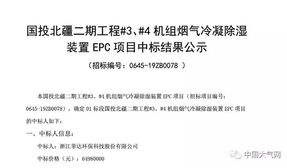 浙江菲達(dá)環(huán)??萍脊煞萦邢薰局袠?biāo)國投北疆二期工程#3、#4機(jī)組煙氣冷凝除濕裝置EPC項(xiàng)目,中標(biāo)價格為64980000元。