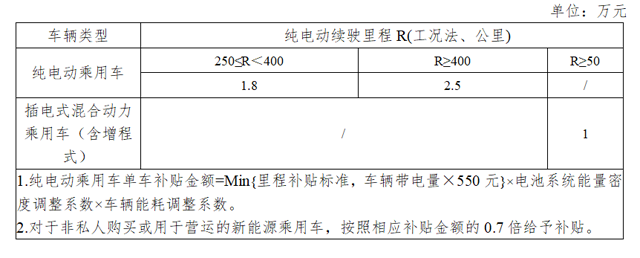 按照上圖,純電動乘用車續(xù)航里程在250公里至400公里(含250公里)的,補貼標準為1.8萬元;續(xù)航里程在400公里及以上的,補貼標準為2.5萬元。而插電式混合動力乘用車(含增程式)工況法續(xù)駛里程不低于50 km,補貼基準也降到了1萬元。在眾多業(yè)界人士看來,最終補貼金額將依據(jù)新版的公式,并選取里程補貼標準和車輛帶電量×550元之間的最小數(shù)值進行計算。