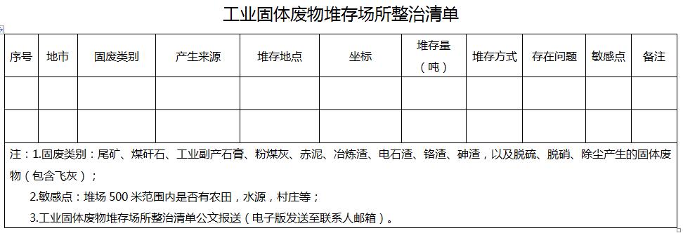 各地對照《關(guān)于開展工業(yè)固體廢物堆存場所基本情況調(diào)查的通知》(粵環(huán)辦函〔2018〕338號),對本行政區(qū)域內(nèi)工業(yè)固廢(尾礦、煤矸石、工業(yè)副產(chǎn)石膏、粉煤灰、赤泥、冶煉渣、電石渣、鉻渣、砷渣,以及脫硫、脫硝、除塵產(chǎn)生的固體廢物)的貯存、堆放場所分布及存量規(guī)模情況等進行全面排查,建立工業(yè)固體廢物堆存場所排查清單。