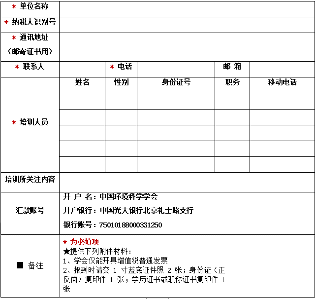 1、培訓(xùn)費(fèi)用:培訓(xùn)班收費(fèi) 3800元/每人,包括培訓(xùn)費(fèi)、資料費(fèi)、證書費(fèi)等。由中國環(huán)境科學(xué)學(xué)會(huì)收取培訓(xùn)費(fèi)并開具發(fā)票(一律開具增值稅普通發(fā)票),請(qǐng)?jiān)趨R款時(shí)備注“環(huán)境修復(fù)項(xiàng)目經(jīng)理”培訓(xùn)費(fèi)用(參加培訓(xùn)人員姓名),多位人員參加則在括號(hào)內(nèi)逐一填寫參加人員姓名,例:環(huán)境修復(fù)項(xiàng)目經(jīng)理培訓(xùn)費(fèi)(小明/小華/小雷)。住宿可統(tǒng)一安排,費(fèi)用自理。