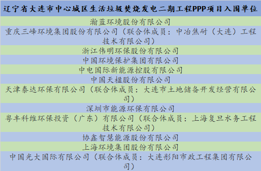 據(jù)中國固廢網(wǎng)跟蹤發(fā)現(xiàn),大連中心城區(qū)垃圾焚燒發(fā)電二期項目不僅日處理規(guī)模大,運營服務(wù)費變動挺大,由最高限價的76元/噸跌至11.11元/噸。早在2018年11月6日,該項目啟動資格預(yù)審,11月30日,項目發(fā)布資格預(yù)審結(jié)果,瀚藍(lán)環(huán)境、三峰環(huán)境、中國環(huán)保、粵豐環(huán)保、上海環(huán)境、光大國際等在內(nèi)的12大名企集體入圍,具體名單如下:
