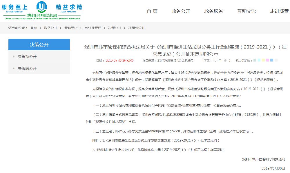近日,深圳市城市管理和綜合執(zhí)法局網(wǎng)站發(fā)布關(guān)于《深圳市推進(jìn)生活垃圾分類工作激勵(lì)實(shí)施方案(2019-2021)》(征求意見稿)公開征求意見的公示,2019-2021年期間,深圳市每年安排生活垃圾分類激勵(lì)補(bǔ)助資金9375萬(wàn)元,其中,各區(qū)財(cái)政共承擔(dān)6250萬(wàn)元,市財(cái)政安排3125萬(wàn)元。生活垃圾分類積極個(gè)人資金補(bǔ)助為1000元。
