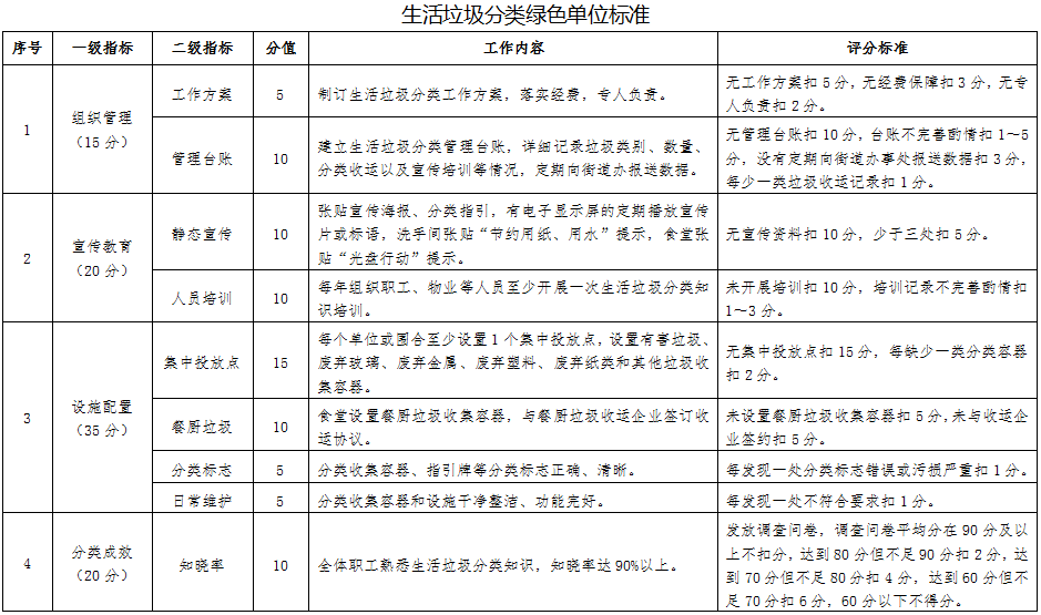 “生活垃圾分類綠色單位”指開展生活垃圾分類且成效顯著的黨政機(jī)關(guān)、事業(yè)單位、學(xué)校、企業(yè)和社會(huì)組織,應(yīng)具備以下條件: