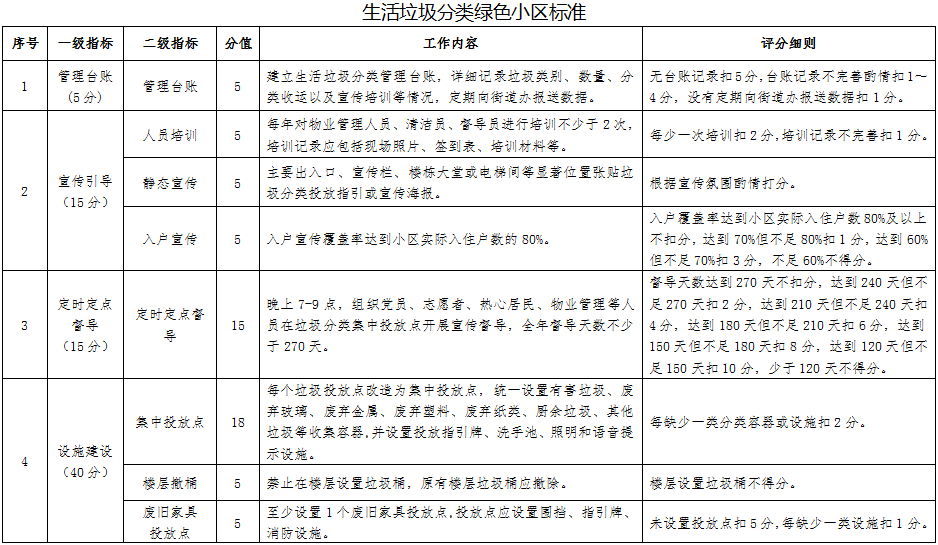 “生活垃圾分類綠色小區(qū)”指開展生活垃圾分類且成效顯著的住宅區(qū),具體條件詳見《生活垃圾分類綠色小區(qū)標(biāo)準(zhǔn)》。