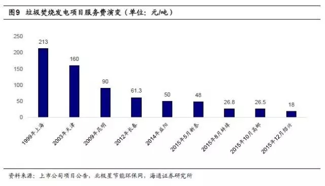 行業(yè)競(jìng)爭(zhēng)加劇,處理費(fèi)下行。在市場(chǎng)參與者逐漸增多和行業(yè)競(jìng)爭(zhēng)逐步加劇的背景下,近年新建的垃圾焚燒項(xiàng)目處理費(fèi)呈下降趨勢(shì)。2015年以來(lái),一些企業(yè)為了搶占市場(chǎng)而壓低價(jià)格,低價(jià)中標(biāo)項(xiàng)目涌現(xiàn):2015年山東新泰項(xiàng)目中標(biāo)價(jià)48元/噸,安徽蚌埠項(xiàng)目中標(biāo)價(jià)26.8元/噸,江蘇高郵項(xiàng)目中標(biāo)價(jià)26.5元/噸,浙江紹興項(xiàng)目中標(biāo)價(jià)更是降至18元,擾亂市場(chǎng)正常秩序。除去少數(shù)惡意壓低價(jià)格的項(xiàng)目,根據(jù)中國(guó)經(jīng)濟(jì)導(dǎo)報(bào)統(tǒng)計(jì),近年來(lái)垃圾焚燒特許經(jīng)營(yíng)項(xiàng)目處理費(fèi)每噸平均在60~80元,整體呈現(xiàn)小幅下降的趨勢(shì)。