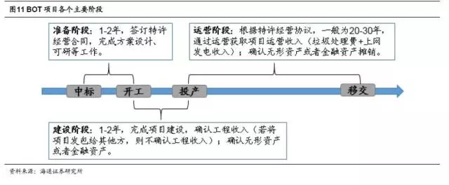 對(duì)項(xiàng)目公司而言,項(xiàng)目中標(biāo)后,主要會(huì)經(jīng)歷三個(gè)階段,分別是準(zhǔn)備階段(一般為1-2年,完成項(xiàng)目的前期準(zhǔn)備工作,簽訂特許經(jīng)營(yíng)合同,完成環(huán)評(píng)、可研報(bào)告等工作)、建設(shè)階段(一般為1-2年,完成項(xiàng)目建設(shè),確認(rèn)工程收入,若項(xiàng)目外包給其他方,則不確認(rèn))和運(yùn)營(yíng)階段(在特許經(jīng)營(yíng)期內(nèi),負(fù)責(zé)項(xiàng)目的運(yùn)營(yíng),獲取垃圾處理費(fèi)補(bǔ)貼和上網(wǎng)發(fā)電收入),特許經(jīng)營(yíng)期到期之后,項(xiàng)目無(wú)償移交給政府。