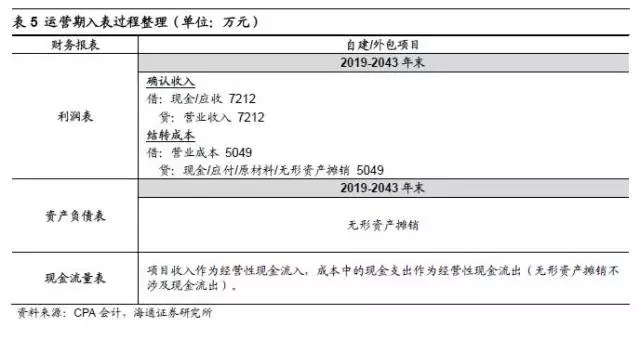 若該項(xiàng)目為項(xiàng)目公司自建,則建設(shè)期項(xiàng)目公司將根據(jù)完工進(jìn)度確認(rèn)工程收入并計(jì)入在建工程,項(xiàng)目完工后在建工程轉(zhuǎn)為無(wú)形資產(chǎn),工程階段雖有工程收入并確認(rèn)利潤(rùn),但并無(wú)實(shí)際經(jīng)營(yíng)性現(xiàn)金流入。若項(xiàng)目公司將項(xiàng)目發(fā)包,通常不確認(rèn)工程收入,即建造期不影響利潤(rùn)表,根據(jù)完工進(jìn)度向承包方支付工程款,確認(rèn)在建工程,項(xiàng)目完工后將在建工程結(jié)轉(zhuǎn)為無(wú)形資產(chǎn)。項(xiàng)目運(yùn)營(yíng)階段,公司確認(rèn)項(xiàng)目運(yùn)營(yíng)收入(主要是垃圾處理費(fèi)和上網(wǎng)發(fā)電收入),結(jié)轉(zhuǎn)相關(guān)成本,成本項(xiàng)包含無(wú)形資產(chǎn)的攤銷。項(xiàng)目建設(shè)期和運(yùn)營(yíng)期的主要會(huì)計(jì)科目錄入如表4和表5: