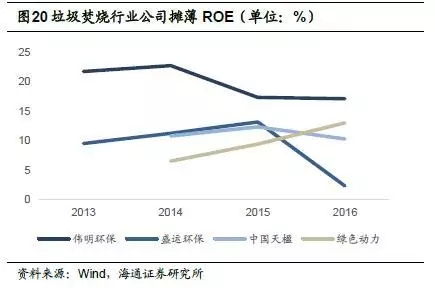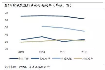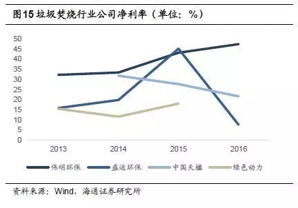 偉明環(huán)保項(xiàng)目運(yùn)營(yíng)毛利率較高,2015年為65.9%,2016年小幅下降,為62.5%;中國(guó)天楹運(yùn)營(yíng)業(yè)務(wù)毛利率也相對(duì)較高,2016年為49.2%,但相較于2014年的65.1%下滑近16個(gè)百分點(diǎn);綠色動(dòng)力2015年毛利率為49.0%;盛運(yùn)環(huán)保2015年運(yùn)營(yíng)業(yè)務(wù)毛利率為45.3%,2016年為18.0%。