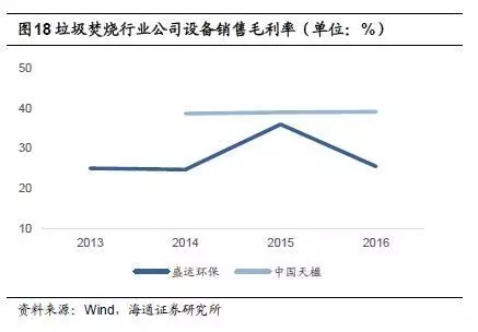 盛運(yùn)環(huán)保和中國(guó)天楹兩家公司確認(rèn)設(shè)備銷售毛利率,中國(guó)天楹設(shè)備毛利率較為穩(wěn)定,近三年維持在38%-39%之間,盛運(yùn)環(huán)保設(shè)備銷售毛利率略低,2015年為36.0%,2016年為25.5%。