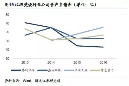 偉明環(huán)保ROE較高,2016年為17%,但相較2013、2014年有一定下滑;盛運(yùn)環(huán)保2016年ROE出現(xiàn)較大下滑,僅為2.3%;中國(guó)天楹2016年ROE為10.3%;綠色動(dòng)力ROE上升趨勢(shì)明顯,2016年達(dá)到13.0%,較2015年上升3.6個(gè)百分點(diǎn)。