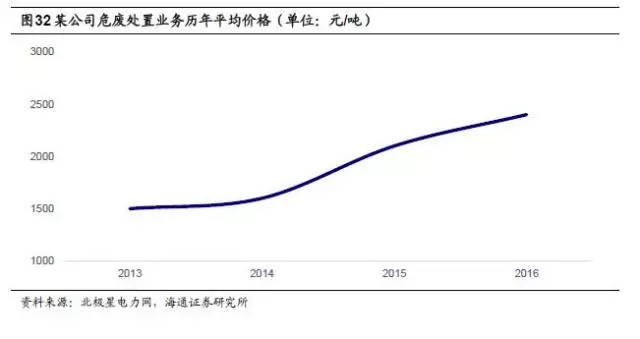 危廢處置價(jià)格穩(wěn)步上升,市場(chǎng)空間巨大。從核準(zhǔn)經(jīng)營(yíng)規(guī)???,危廢處置產(chǎn)能緊缺,2015年核準(zhǔn)處置規(guī)模僅982.4萬(wàn)噸/年。近年來(lái),危廢處置價(jià)格呈現(xiàn)穩(wěn)步上升趨勢(shì)。以行業(yè)內(nèi)某領(lǐng)先企業(yè)為例,2013年,其危廢處置業(yè)務(wù)平均價(jià)格為1500元/噸左右,2016年則上升至2500元/噸左右。以全國(guó)環(huán)境統(tǒng)計(jì)公報(bào)數(shù)據(jù)為基礎(chǔ),假設(shè)未來(lái)幾年危廢產(chǎn)生量保持過(guò)去十年復(fù)合增長(zhǎng)率12%的增速,保守估計(jì)處置率為35%,單位處置成本為2500元/噸,則預(yù)計(jì)2020年危廢處置市場(chǎng)為613億元,2017-2020處置市場(chǎng)空間總計(jì)2086億元??紤]到還有大量的危廢沒(méi)有進(jìn)入國(guó)家統(tǒng)計(jì)口徑,若將這些量考慮在內(nèi),市場(chǎng)空間還將提升2-3倍。
