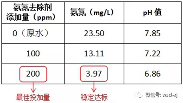 最終經(jīng)過(guò)現(xiàn)場(chǎng)調(diào)試,氨氮去除劑確定在200ppm(每噸廢水加0.2kg)就可以將氨氮控制在5ppm以下。