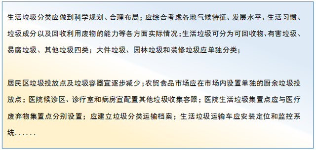 標(biāo)準(zhǔn)分為8章,包括總則、術(shù)語、基本規(guī)定、垃圾類別、分類投放、分類收集、分類運輸、分類處理。