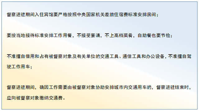 也就是說,環(huán)保督察工作也將參照此標(biāo)準(zhǔn)。而《中央生態(tài)環(huán)境保護督察紀(jì)律規(guī)定》也從差旅、住宿、接待、交通工具使用等方面提出了具體要求。包括: