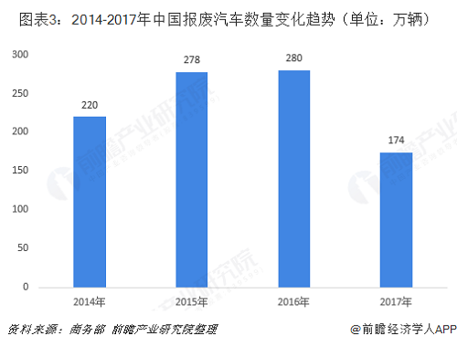 根據(jù)商務部最新統(tǒng)計數(shù)據(jù)顯示,2017年我國汽車報廢數(shù)量為174萬輛。我國整體汽車報廢率較低,明顯低于發(fā)達國家6%-8%的水平。