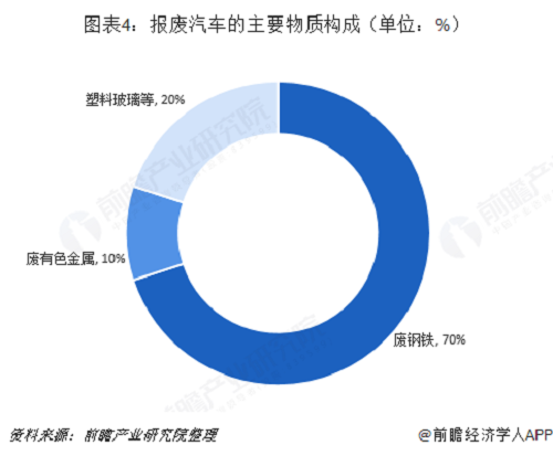 眾所周知,報廢汽車所含的有價資源較多。報廢汽車主要含有黑色金屬、有色金屬、貴金屬(催化劑)、電子設備、玻璃、車用塑料等。其中,廢鋼等黑色金屬約占70%,銅鋁等有色金屬約占10%,其他物料約占20%。其中廢鋼鐵、有色金屬90%以上都可以回收利用,玻璃、塑料等的回收利用率也可達50%以上??梢妶髲U汽車的再回收利用價值較大。