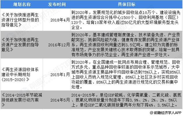 近些年,國家為了鼓勵居民和企業(yè)進行資源回收,相繼實施了一系列政策,如2016年5月,商務部等六部門頒布了《關于推進再生資源回收行業(yè)轉(zhuǎn)型升級的意見》,其中指出要加快轉(zhuǎn)變發(fā)展方式、促進行業(yè)轉(zhuǎn)型升級為主線,順應"互聯(lián)網(wǎng)+"發(fā)展趨勢,著力推動再生資源回收模式創(chuàng)新,推動經(jīng)營模式由粗放型向集約型轉(zhuǎn)變,推動組織形式由勞動密集型向勞動、資本和技術密集型并重轉(zhuǎn)變,建立健全完善的再生資源回收體系。2019年3月,工信部和國開行聯(lián)合發(fā)布了《關于加快推進工業(yè)節(jié)能與綠色發(fā)展的通知》,指出在有條件的城鎮(zhèn)推動水泥窯協(xié)同處置生活垃圾,推動廢銅鐵、廢塑料等再生資源綜合利用;重點支持開展退役新能源汽車動力蓄電池梯級利用和再利用。