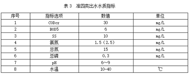原水經(jīng)處理后,出水水質(zhì)達到《城鎮(zhèn)污水處理廠污染物排放標準》一級A標準或參照《地表水環(huán)境質(zhì)量標準》IV類水的準四類水達標排放,水質(zhì)指標見下表: