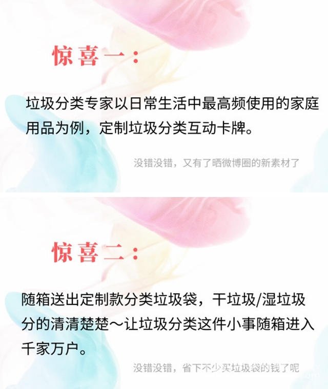 獨寵上海小伙伴可還行?說好的為了垃圾分類逃離上海呢!一份驚喜就把你收!買!了!不過港真,這波助力垃圾分類的操作也是要雙擊666,簡單實用真“驚喜”,畫面精美忍不住看一眼再看一眼。